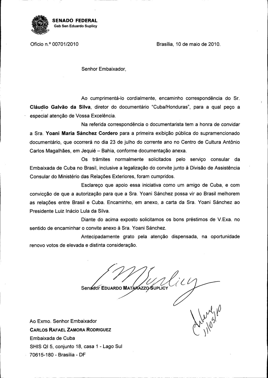 "Vou à Bahia porque, se alguém fez o impossível para eu sair do país, foi Dado Galvão. Desde que filmou uma entrevista comigo em Havana, ele tem sido incansável. Mesmo quando me faltava esperança, ele a mantinha" YOANI SÁNCHEZ - FOLHA DE SÃO PAULO